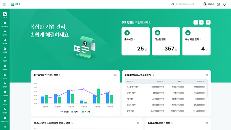 영업, 생산, 구매, 인사, 재무, 회계 등 비즈니스 전반의 프로세스 통합 관리