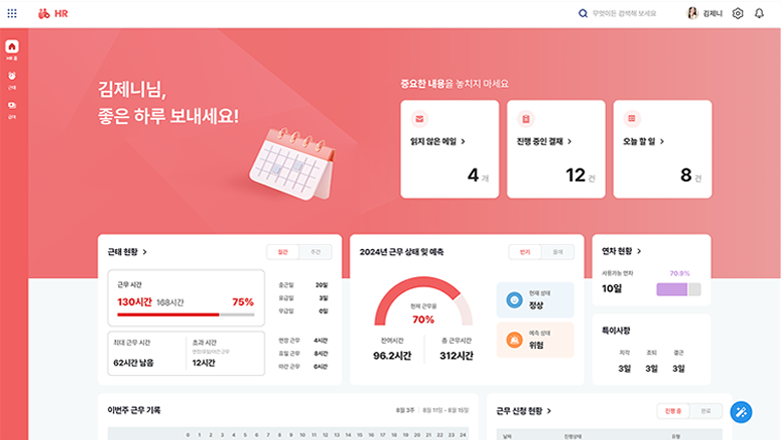 근태관리 기능을 통해 출퇴근, 휴가 신청 및 승인, 근무시간 통계 등을 손쉽게 관리