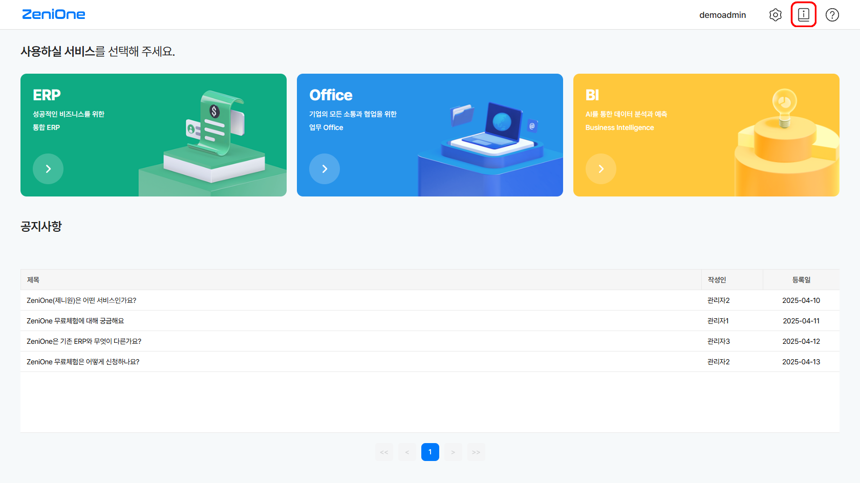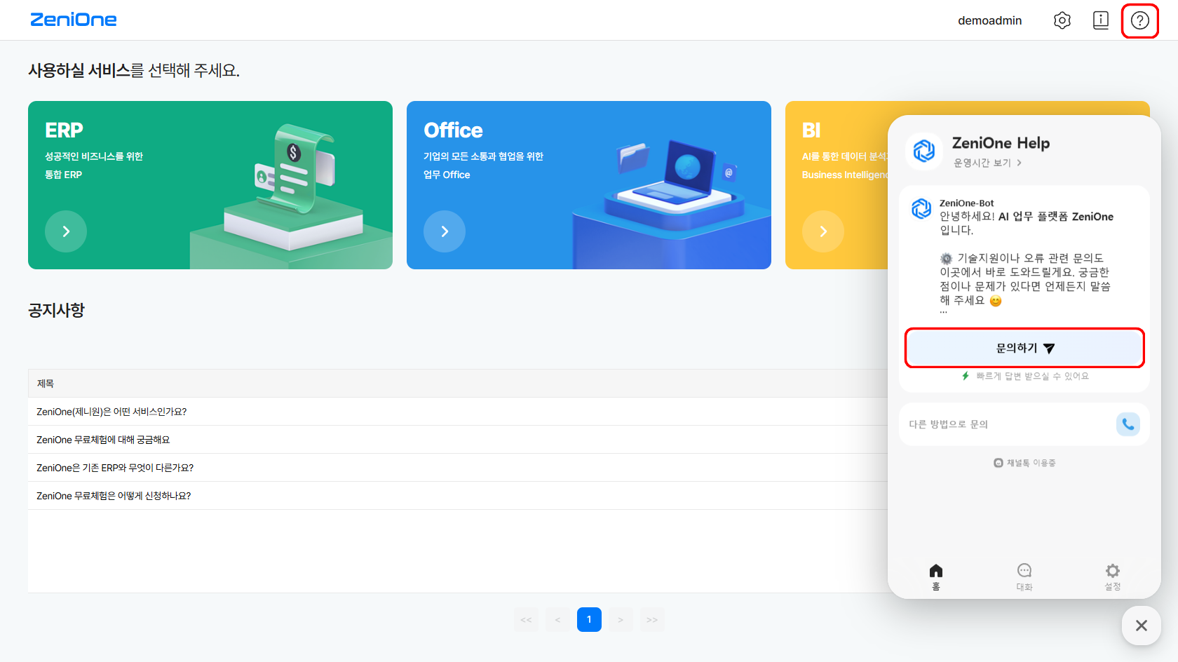 ZeniOne의 매뉴얼은 로그인 후 화면 우측 상단에 위치한 ‘도움말’ 아이콘을 통해 확인할 수 있습니다.