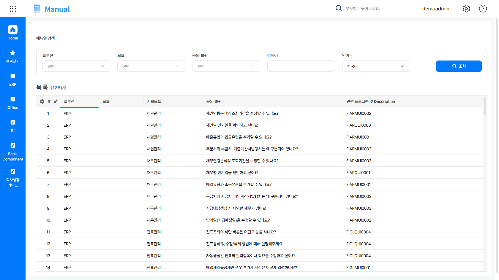 해당 아이콘을 클릭하면 ‘매뉴얼’ 메뉴가 제공되며, 원하는 모듈이나 기능명을 선택하여 매뉴얼을 열람하실 수 있습니다.